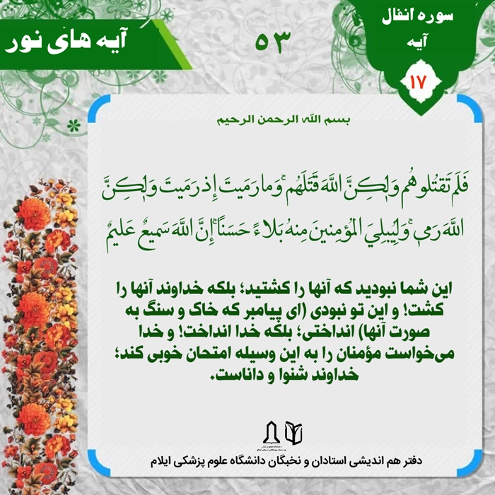 [به کشتن دشمنان بر خود مبالید] شما آنان را نکشتید، بلکه خدا آنان را کشت. [ای پیامبر!] هنگامی که به سوی دشمنان تیر پرتاب کردی، تو پرتاب نکردی، بلکه خدا پرتاب کرد [تا آنان را هلاک کند] و مؤمنان را از سوی خود به آزمایشی نیکو بیازماید؛ زیرا خدا شنوا و داناست.